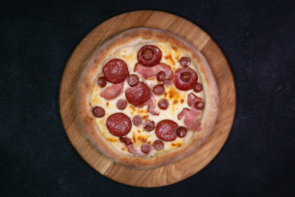 Ingredients: wheat flour (premium grade) (29%), mozzarella cheese (18%), drinking water (16%), cream 18% (12%), smoked ham (9%), hunter’s sausages (7%), salami sausage (7%), compressed baker’s yeast, white granulated sugar, refined sunflower oil, salt.