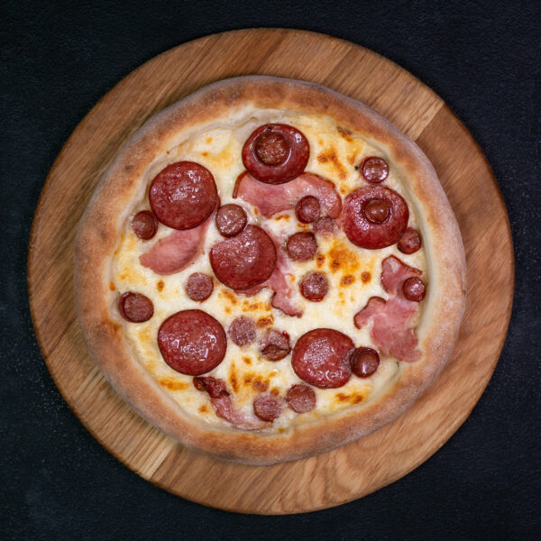 Ingredients: wheat flour (premium grade) (29%), mozzarella cheese (18%), drinking water (16%), cream 18% (12%), smoked ham (9%), hunter’s sausages (7%), salami sausage (7%), compressed baker’s yeast, white granulated sugar, refined sunflower oil, salt.